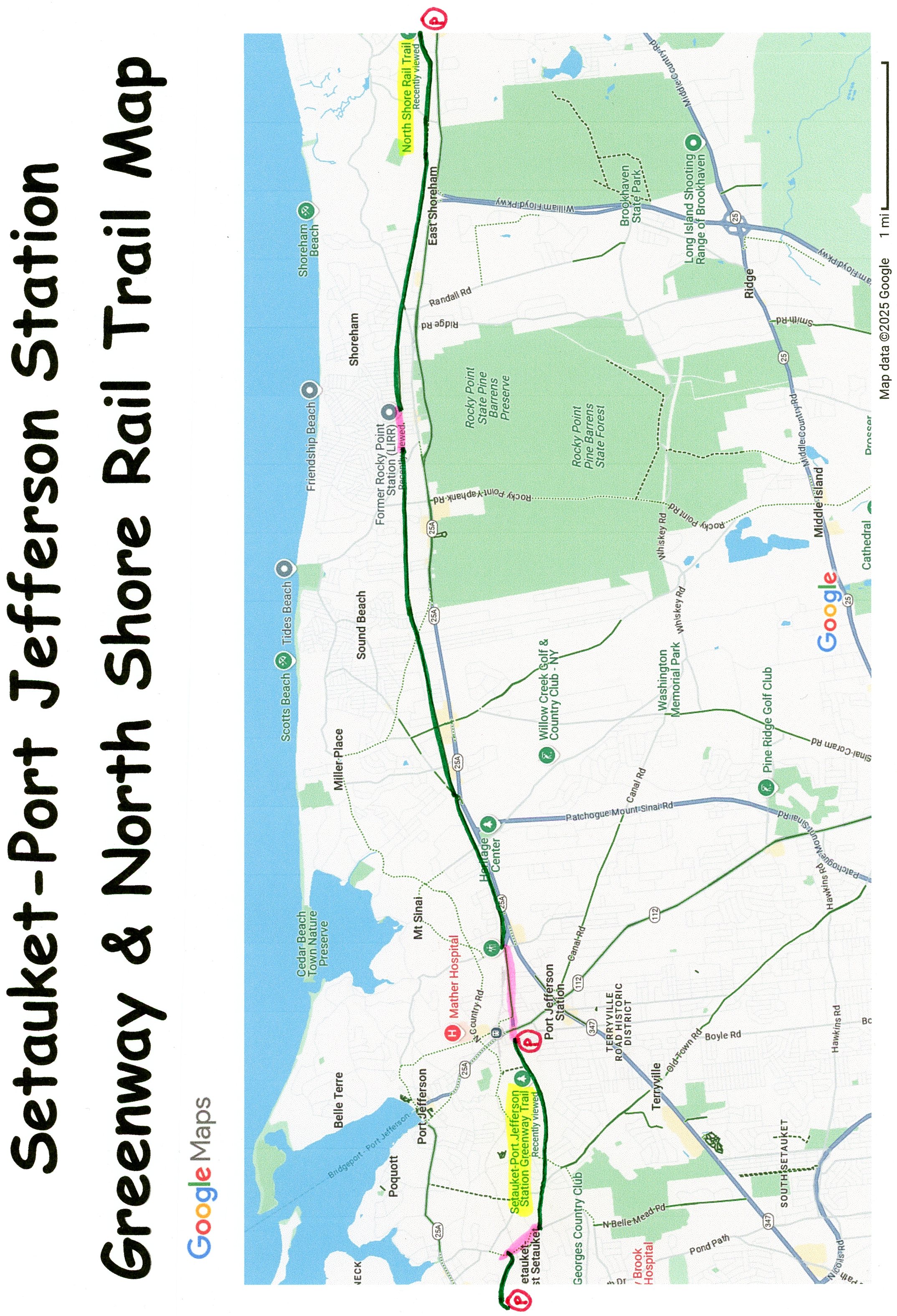 The Setauket-Port Jefferson Station Greenway is a paved trail that travels from Setauket East, to Port Jefferson along a hilly, winding trail. A BIKE LANE continues East, connecting to the North Shore Rail Trail in Mt Sinai. This trail continues East, along the former Long Island RR right-of-way, owned by the Long Island Power Authority, to Wading River. For more information visit; Setauket-Port Jefferson Station Greenway .