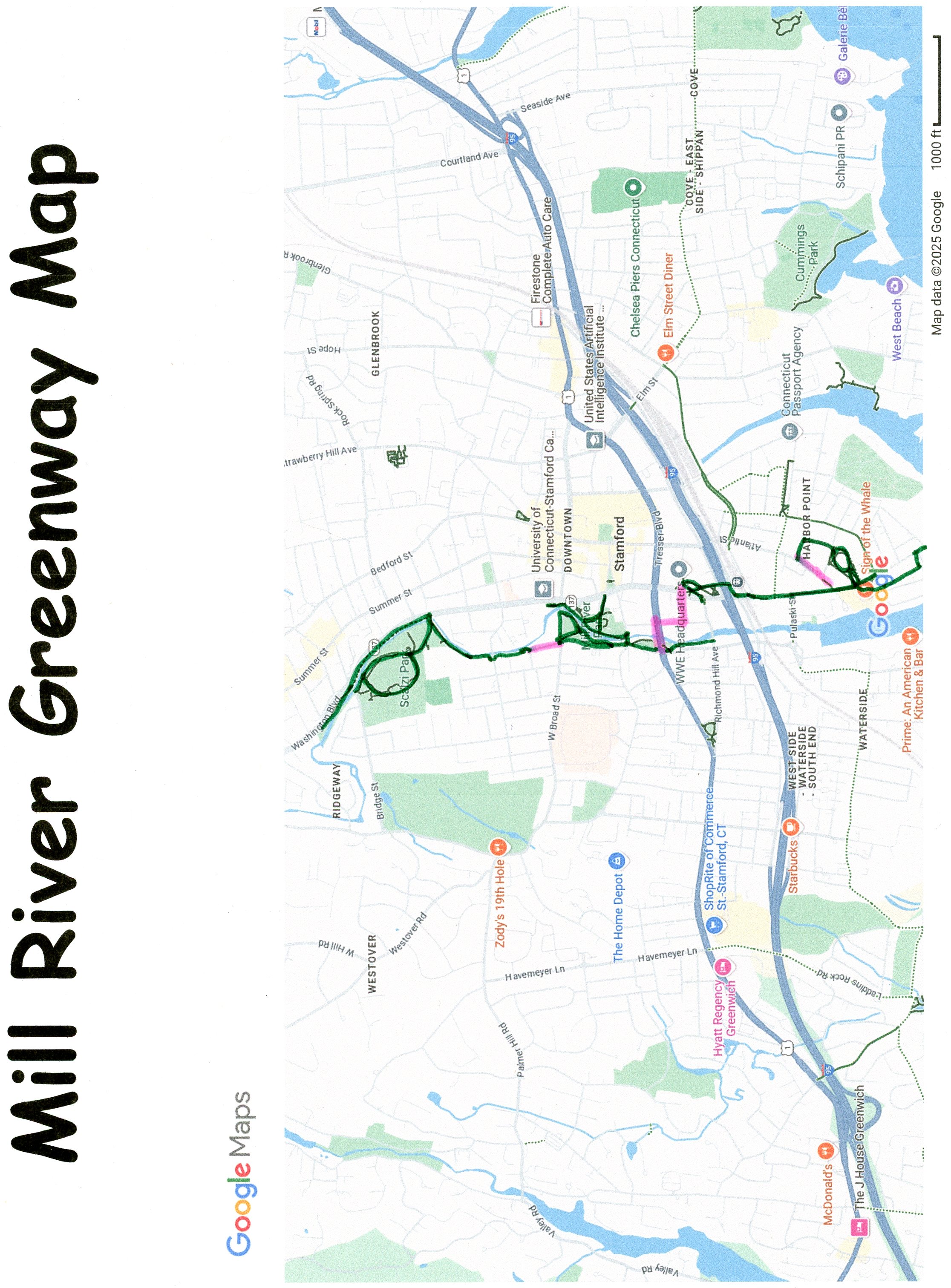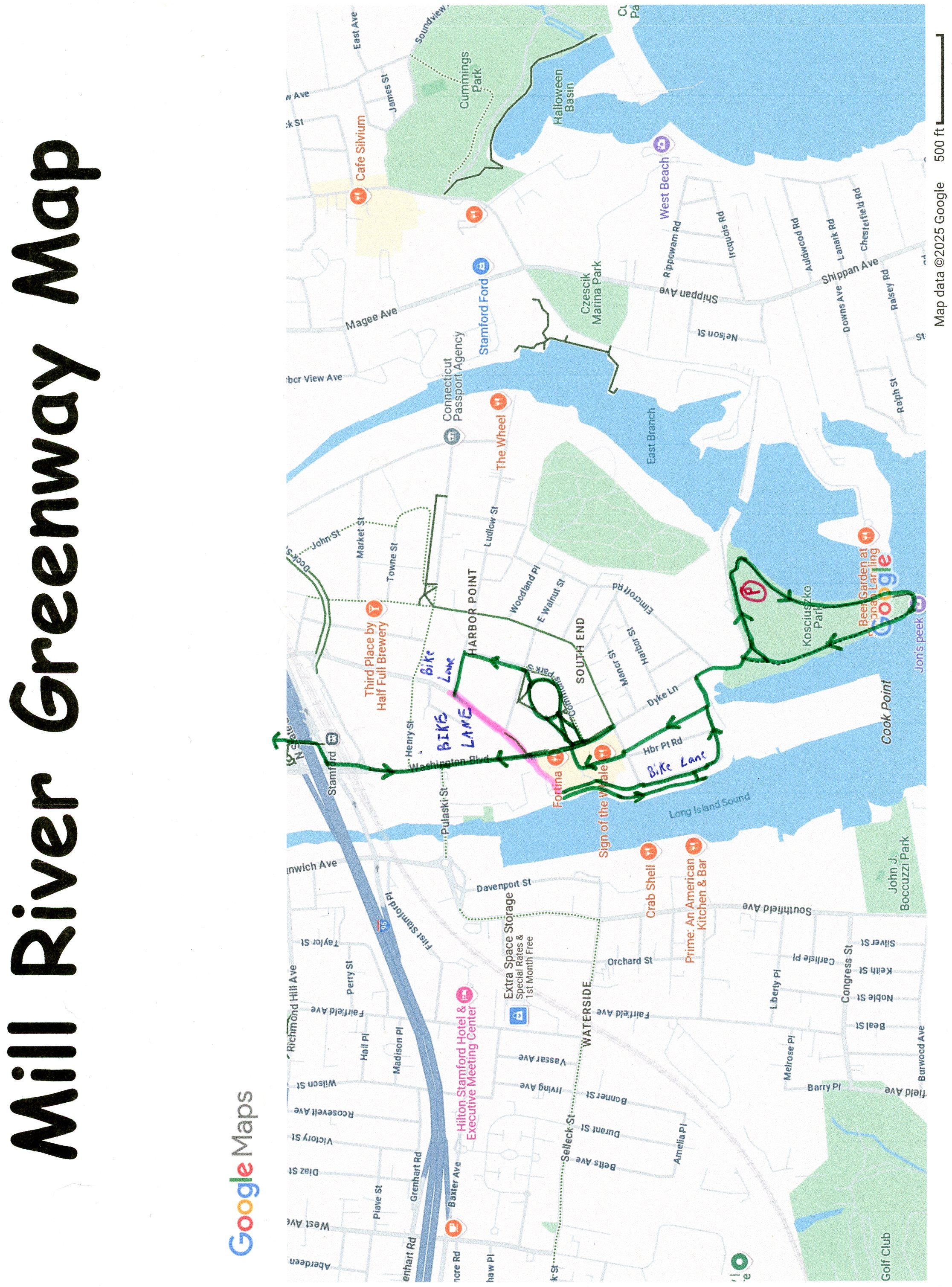 The Mill River Greenway is a series of connected trails & BIKE LANES that start from Kosciuszko Park and travels North, to Mill River Park, where it follows the Mill River (Rippowam River) North, to Scalzi Park. The Mill River Greenway travels along both the Western & Eastern Sides of the Mill River, however it is not complete along both sides. Heading North, I follow the Eastern Side of the river and returning South, I follow the Western Side of the river, but switch river sides to bypass Gaps. For more information visit; MILL RIVER PARK .