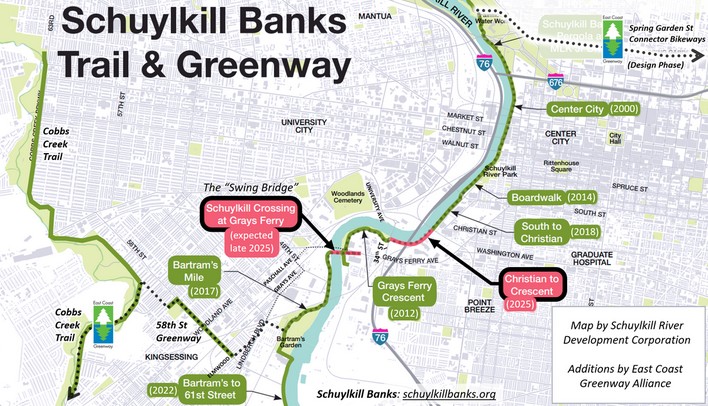 Part of the Schuylkill River Trail is part of the EAST COAST GREENWAY , a planned biking & hiking route stretching 3,000 miles from Maine South, to Florida. When complete it will traverse 15 states with a mostly off-road path.