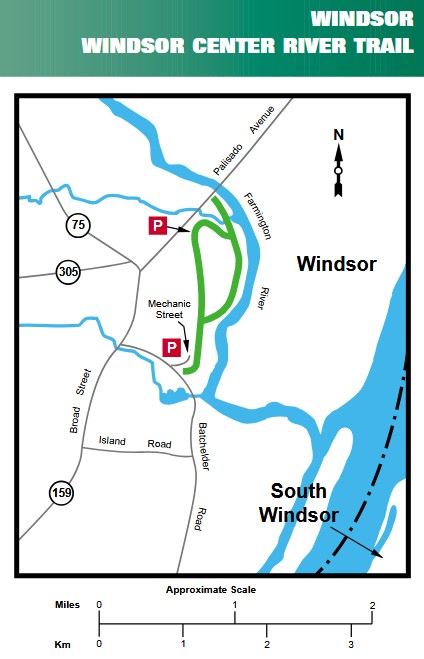 From I-91, take exit 38 and follow Route 75 south for 2 miles to Windsor Center. Turn left at the traffic light onto Route 159 north. A ¼ mile down on your right will be the Palisado Ave parking lot [Northwestern End], with trail Map sign. If  you take the next left on Pleasant St, it will bring you to Pleasant Street Park [Northern End]. The trail starts near the boat launch, by the Farmington River.