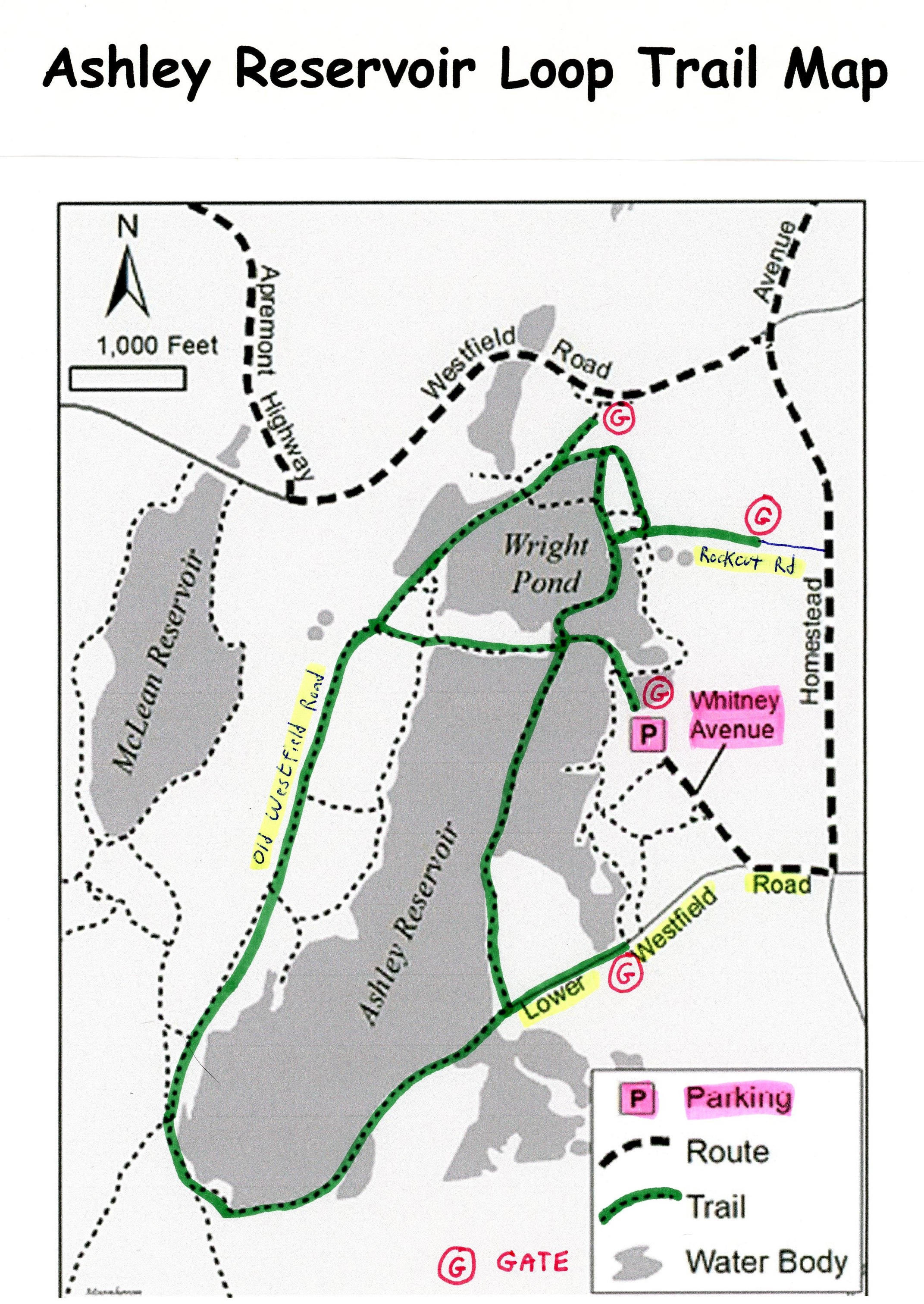 The Ashley Reservoir was constructed in 1897 and is part of the West Holyoke Water Works. The Ashley Reservoir Trail Loops around Ashley Pond, along its Southern Section and Wright Pond, along its Northern Section. This is a very scenic trail with plenty of water fowl, turtles, lily pads and reeds. There are a total of 4 Gates leading into the reservoir, but only the Whitney Ave Gate has parking.
