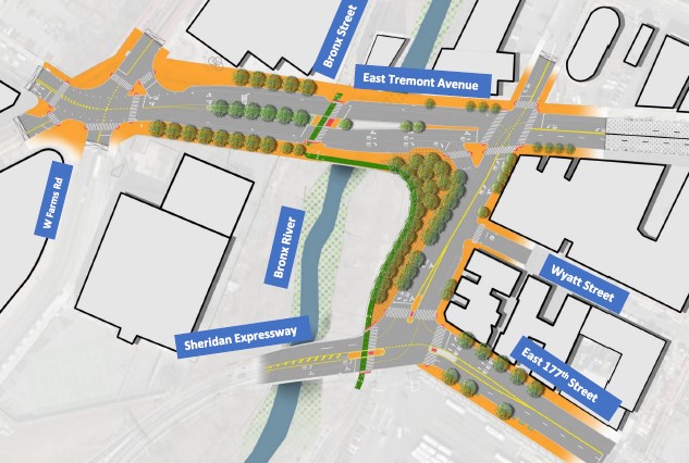 Note; A short Gap exists as of 2025. Future construction will take the trail across E Tremont St, then East, across the river, then South, to the Sheridan Expressway and a crosswalk to the existing section. This will bypass the dangerous current route along E 177th St. Groundbreaking commenced Dec. 2025. See; Map Below.