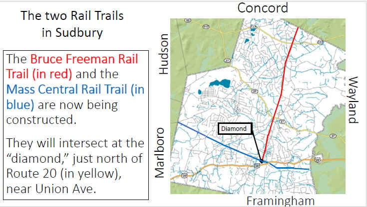 Note; Future construction will continue the Bruce Freeman Rail Trail South, another 1.3 miles to Framingham, where the trail will continue South, another 3.5 miles, traveling underneath I-90 to Framingham State University. Currently, as of 2025, the Sudbury section is in the design phase.