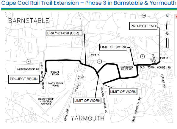 In Barnstable, Phase 3, will extend the Cape Cod Rail Trail from Mary Dunn Rd East, 4 miles to Higgins Crowell Rd in West Yarmouth. It will then curve through the woods, turning South and connecting to the current section of the Cape Cod Rail Trail.
