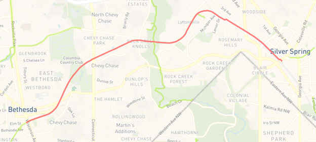 Note; In Bethesda, the trail used to travel through the Wisconsin Ave Tunnel, where it connected to the old Georgetown Branch Trail, which traveled Northeast, to Silver Spring. However, the old converted rail bed between Bethesda & downtown Silver Spring is currently returning to a transit line, the "Purple Line". A new paved trail is being installed alongside this new transit line and will become an extension of the Capitol Crescent Trail. Completion is expected in Fall 2026. See; PURPLE LINE/CCT EXTENSION .