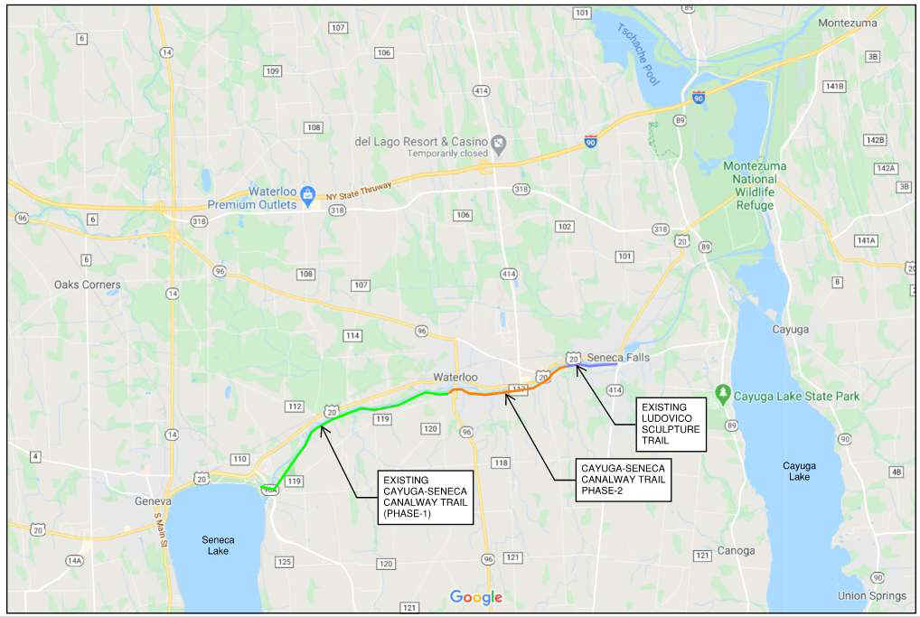The Cayuga-Seneca Canal Trail is a proposed multi-use trail that will follow the Cayuga-Seneca Canal from Seneca Lake in Geneva, East, to the Montezuma National Wildlife Refuge. Currently two sections of the trail have been completed. From Geneva and Seneca Lake, East, to Waterloo. A GAP exists East, to Seneca Falls and the Ludovico Sculpture Trail. At Seneca Lake in Geneva, another trail, the Seneca Lake Waterfront Trail connects to the Western End of the Cayuga-Seneca Canal Trail. The Cayuga-Seneca Canal connects the Erie Canal to Cayuga Lake and Seneca Lake of the Finger Lakes Region of New York. For more information visit; CAYUGA-SENECA CANAL TRAIL & CAYUGA-SENECA CANAL TRAIL .