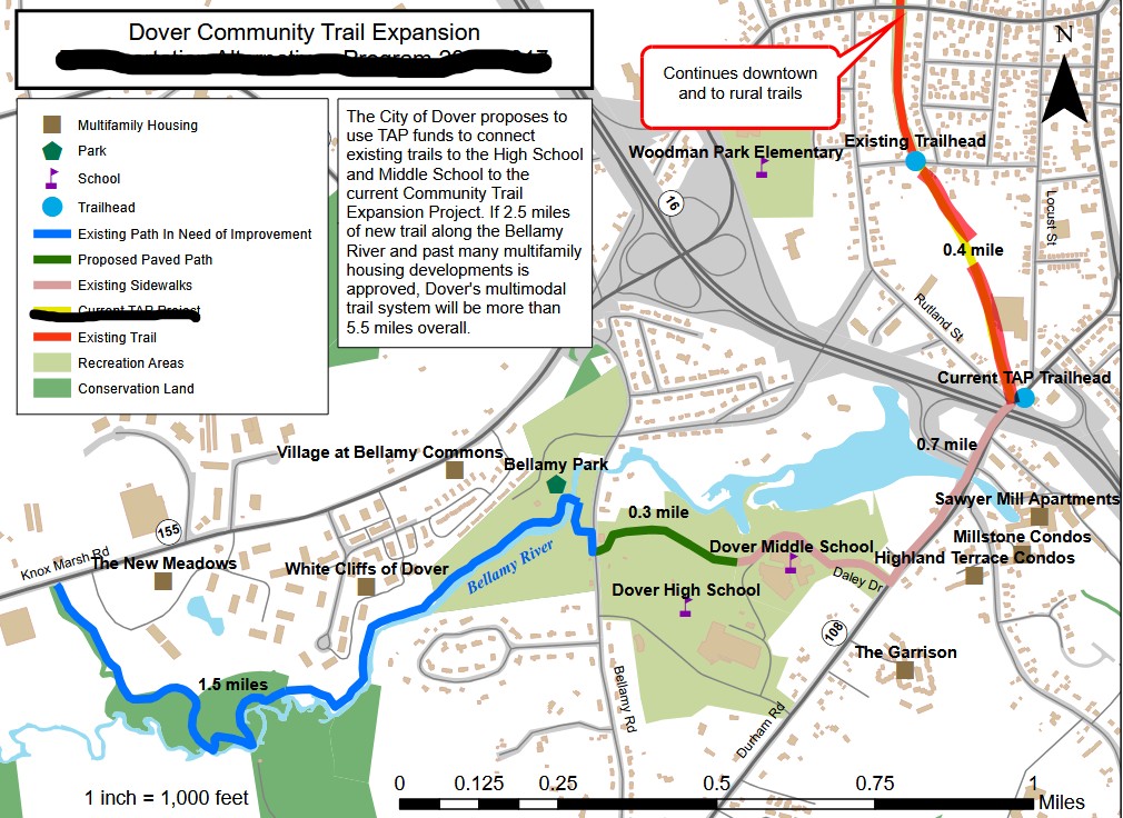 The planned Southern Section will extend the trail South, alongside Central Ave/Route 108 to Dover Middle School, where it will travel West, past Dover High School to Bellamy Park. It will then follow the Bellamy River West, to Route 155.