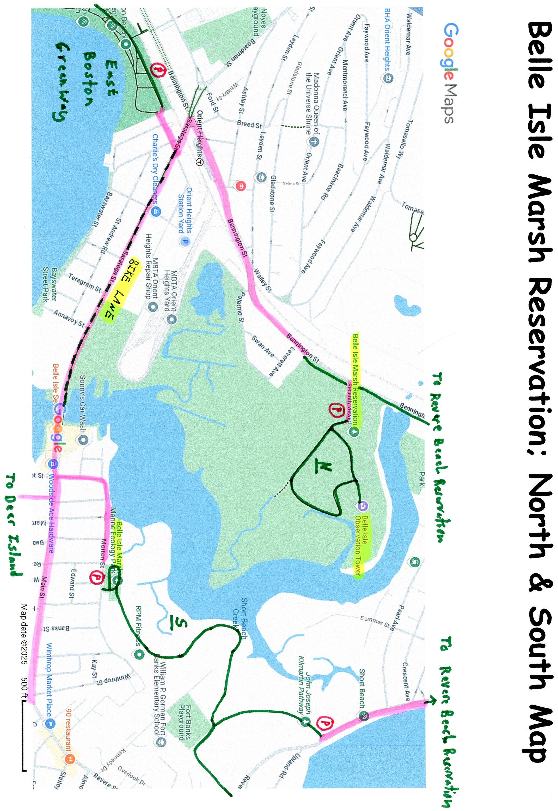 From *Barnes Ave in East Boston; [Re-zeroing Mileage] Travel on-road, along Barnes Ave (residential) out to Saratoga St (Route 145). Cross Saratoga St to a BIKE LANE and head left, across a bridge over the RR tracks out to Bennington St. Head right, Northeast, on-road (sidewalk available), past the MBTA's Orient Heights Station. After 0.8 miles you'll pick up a narrow paved trail as you travel between Bennington St and Belle Isle Marsh. You'll come to the entrance for the Belle Isle Marsh Reservation; North. Turn right to reach the parking lot after 1 mile. A Map Board is located here. For more information visit; BELLE ISLE MARSH RESERVATION & FRIENDS OF BELLE ISLE MARSH .