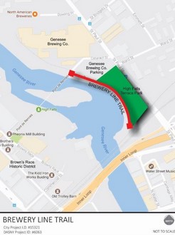 Note; From the Pont de Rennes Pedestrian Bridge, future plans will continue the trail North, along an old rail bed and alongside the future, Roc the Riverway "Tree Top Trail" park to Bausch St. North, past Bausch St, will be the future Roc the Riverway "High Falls Adventure" park.