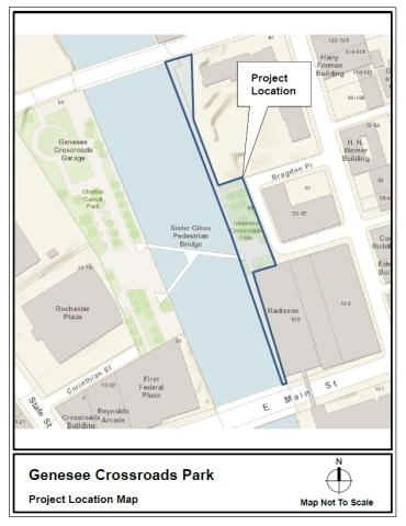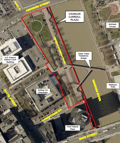 The Charles Carroll Plaza & Sister Cities Pedestrian Bridge are both complete. The Genesee Crossroads Park Project is scheduled to start in 2025. See; Maps Below.