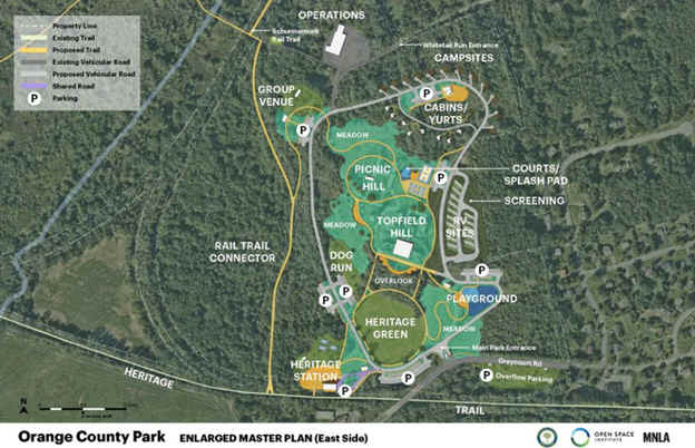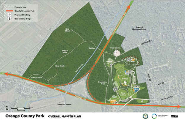 Note; Another old rail bed (old Erie Railroad) heads Northeast, from here through Blooming Grove, Washingtonville to Moodna Viaduct, a scenic railroad trestle in the Salisbury Mills section of Cornwall. Phase 1 construction is underway in 2025 to convert the first 2.5 miles of the 10 miles of this old rail bed into the Schunnemunk Rail Trail and turn Camp LaGuardia into a Park. See Maps Below.