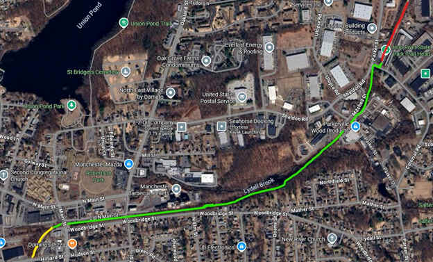 Note; Construction is planned to begin Spring 2026 and will extend the trail Southwest, to the Cheney Rail Trail in Manchester and consist of stone-dust. A pedestrian bridge will be built to cross Lydall Brook & about 10 parking spaces will be created on Old North Main St (behind the library). See; Map Below.
