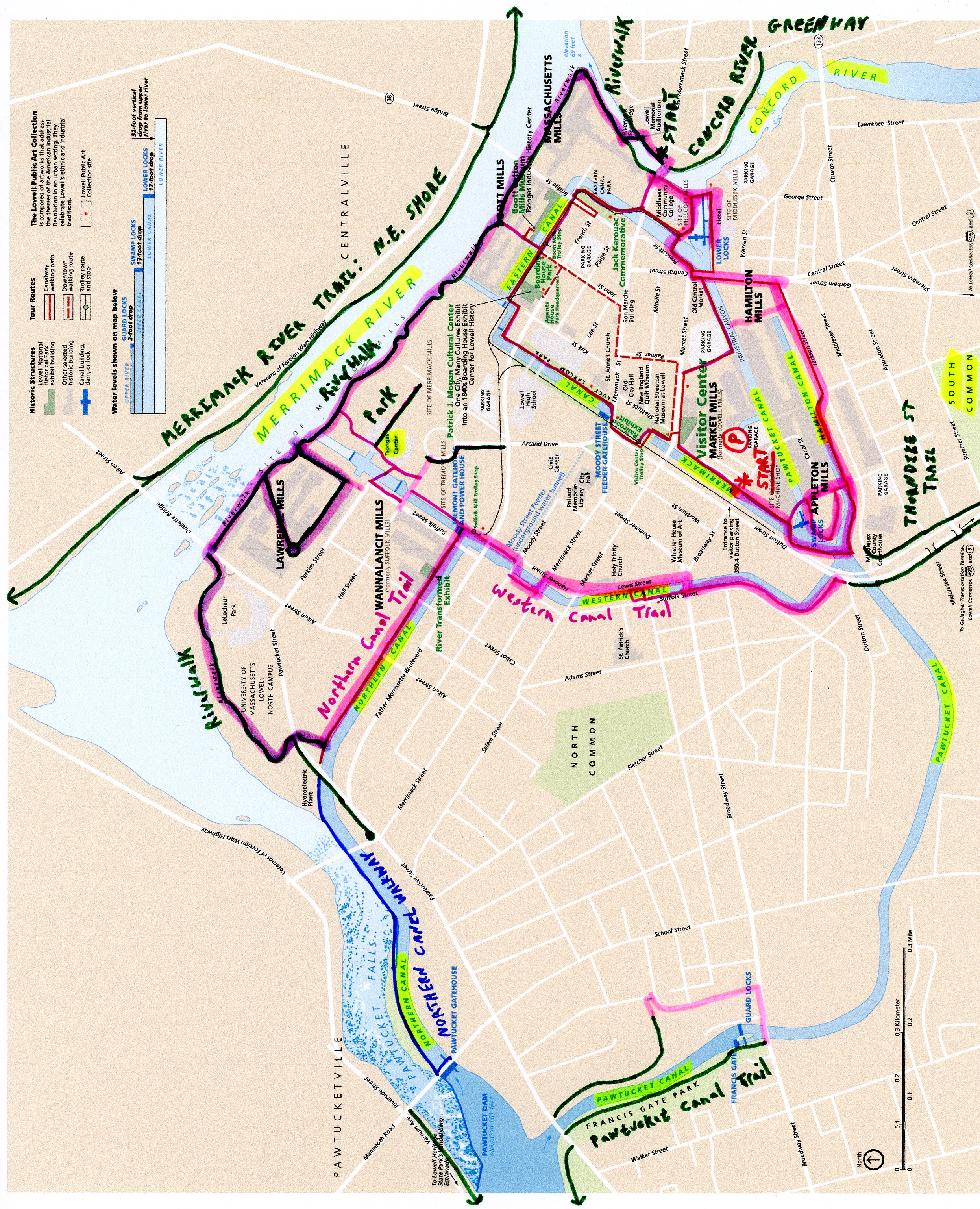 Starting from the *Lowell NHP Visitor Center; The Lowell NHP Canalwalk starts from the *Intersection of Canal & Dutton Streets, next to the Merrimack Canal at the Park entrance.