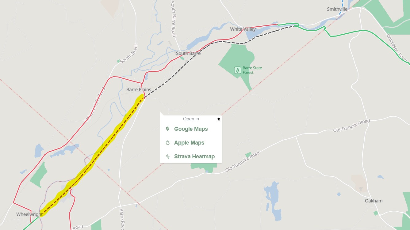 The trail currently ends at Maple St in the Wheelwright section of New Braintree after 0.9 miles. Old RR tracks still embedded in the road.