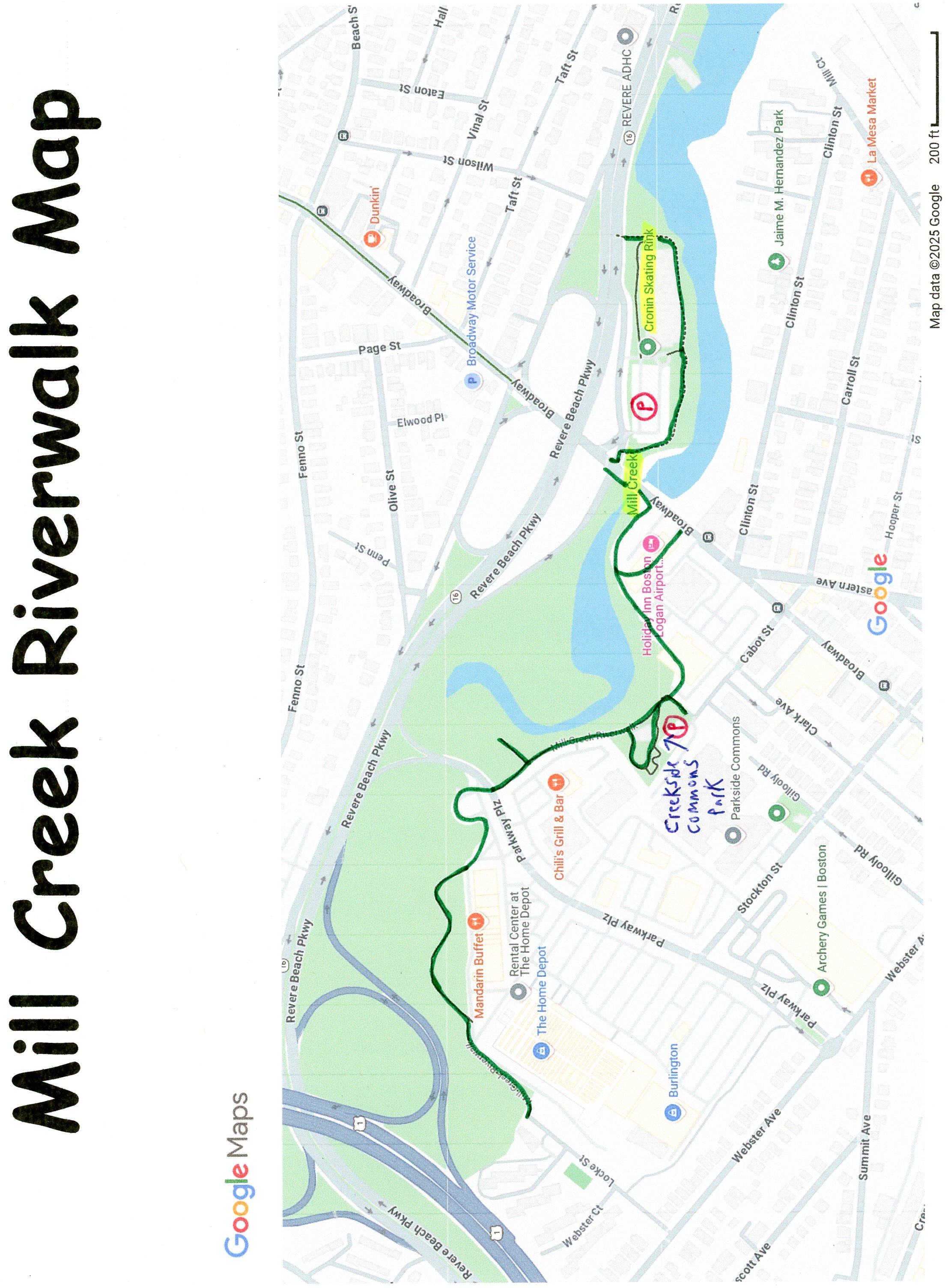 Note; A stone-dust trail travels East, around the Skating Rink along the Northern Side of Mill Creek out to Revere Beach Pkwy after 0.2 miles.