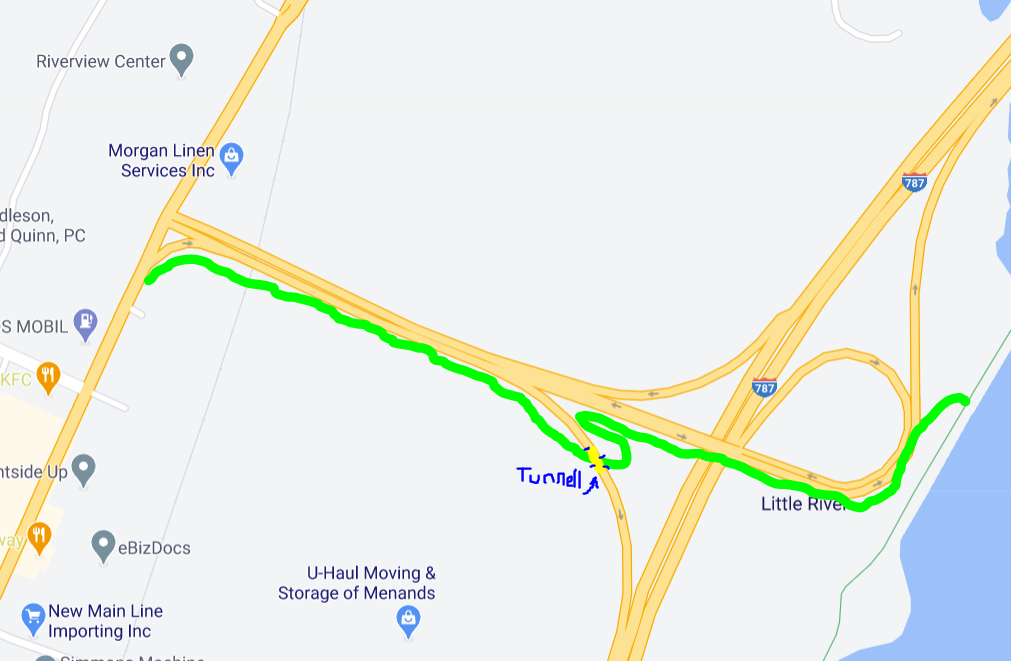 Note; Straight leads out to Dunsbach Ferry Rd, where the old rail bed is blocked by I-87.