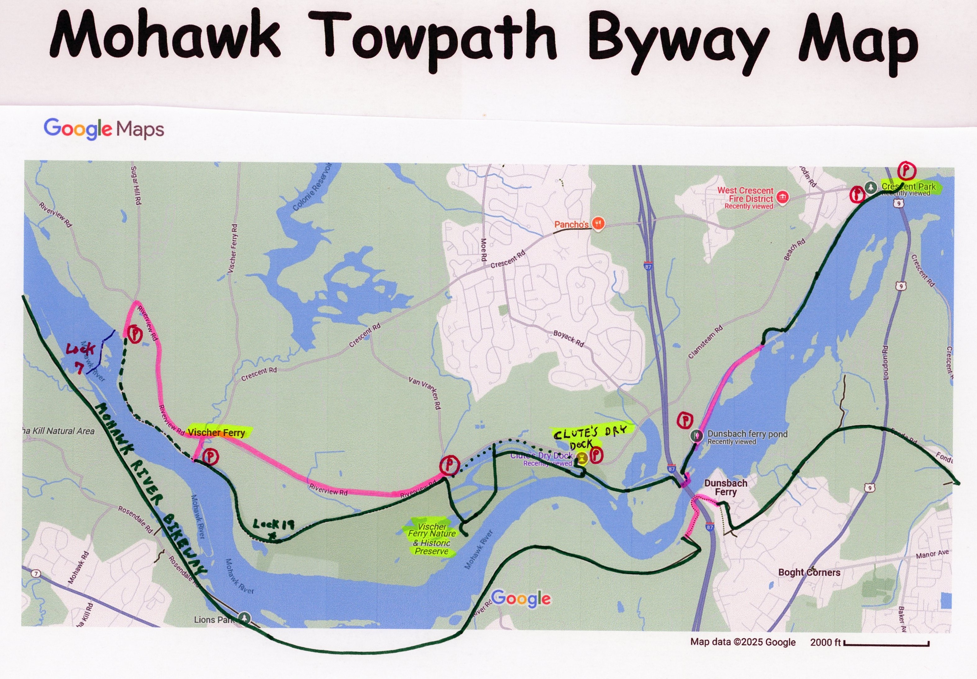 The Mohawk Towpath Scenic Byway follows both the Erie Canal and the Mohawk River from Schenectady, East to Waterford, highlighting the Erie Canal's cultural sites. Stops along this route coincide with the Mohawk Scenic Byway Audio Tour (518-649-9990). The Scenic Byway is an on-road route, but you can utilize several Trails that follow parts of this route. In the Clifton Park hamlet of Vischer Ferry, you can utilize the Mohawk Towpath Byway Trail, that travels through the Vischer Ferry Preserve. Further East, you can then utilize the Crescent Trail, which travels through Clifton Park Northeast, to Crescent Park in Waterford. In Waterford, you can utilize the Flight of Locks Trail , which is part of the Erie Canal. In Cohoes, you can utilize the Cohoes Heritage Trail, which can be accessed off the Mohawk-Hudson Bikeway; Erie Canalway Trail; Albany-Pattersonville . The Mohawk Towpath Byway Trail travels along sections of both the 1825 Erie Canal & 1842 Enlarged Erie Canal. For more information visit; MOHAWK TOWPATH SCENIC BYWAY , FRIENDS OF THE MOHAWK TOWPATH BYWAY & VISCHER FERRY PRESERVE .