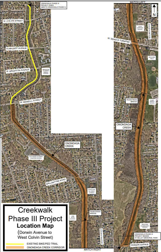 Note; Phase 3 will continue the trail South, alongside Onondaga Creek, 3 miles to Dorwin Ave. Design phase 2025.