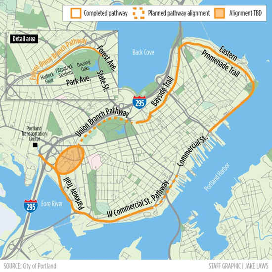 Note; The Union Branch Pathway will continue the trail Southwest, from the Bayside Trail, along the former Union Branch RR bed (along the Northern edge of Deering Oaks Park) to Park Ave. Construction scheduled for 2025.