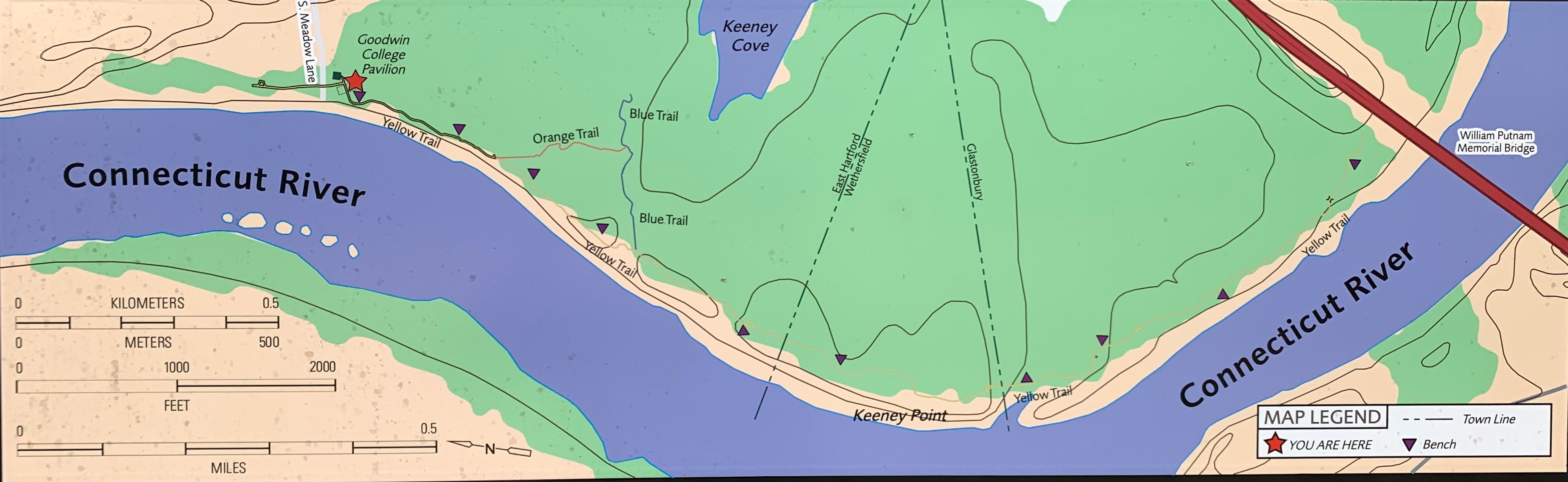 Starting from Goodwin Colleges parking pavilion [Northern End]; Map Board and Porto-Potty located here. Caution trail floods during the Spring.