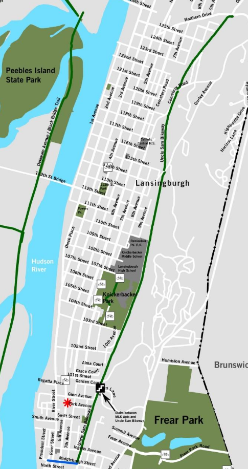 Turn right, East, following a sidewalk along Broad St and across the Hudson River to Troy. Continue straight across 2nd Ave (Route 4) and on-road along 126th St (residential). Follow this road as it turns South and narrows, bringing you to 125th St. Continue left, East, on-road (no shoulder or sidewalk) up a small hill. At the five-way intersection, bare left to Northern Dr (no shoulder) and follow it up a small hill to the start of the Uncle Sam Bikeway on your right after 1.2 miles.